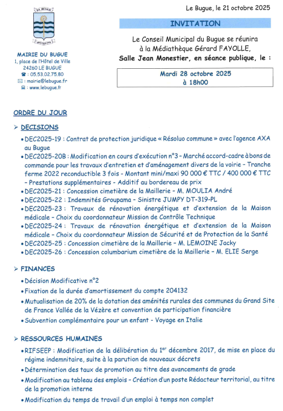 Le Conseil Municipal du Bugue se réunira à la Médiathèque Gérard FAYOLLE, Salle Jean Monestier, en séance publique, le mardi 28 octobre 2025 à 18h00
