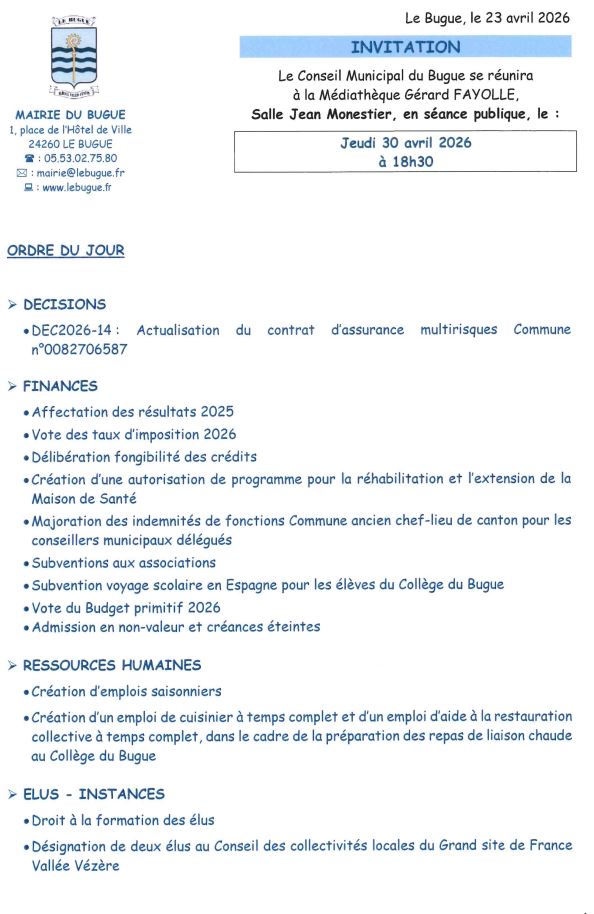 Le Conseil Municipal du Bugue se réunira à la médiathèque G. FAYOLLE, salle Jean MONESTIER, en séance publique, le jeurdi 30 avril 2026 à 18h30