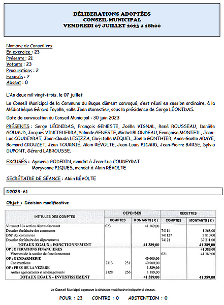 Délibérations adoptées lors du conseil municipal du 07 juillet 2023