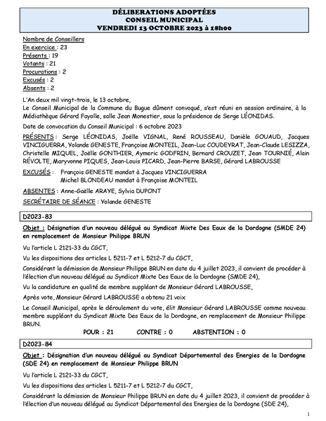 Délibérations adoptées lors du conseil municipal du 13 octobre 2023