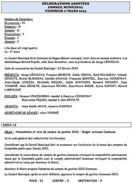 Délibérations adoptées lors du conseil municipal du 1er mars 2024